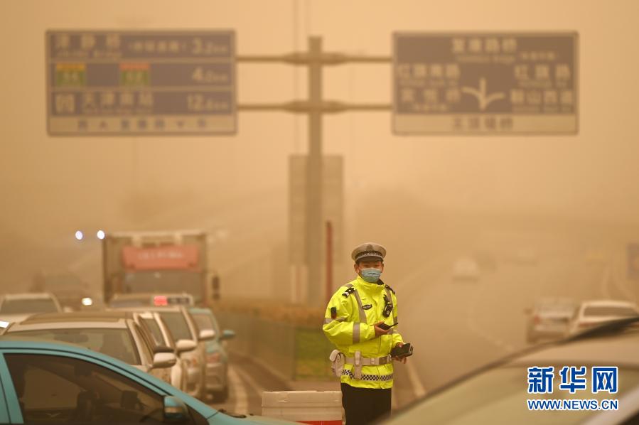 3月15日,交警在天津市南開區(qū)道路上執(zhí)勤。當(dāng)日,我國(guó)北方多地出現(xiàn)沙塵天氣。新華社記者 李然 攝