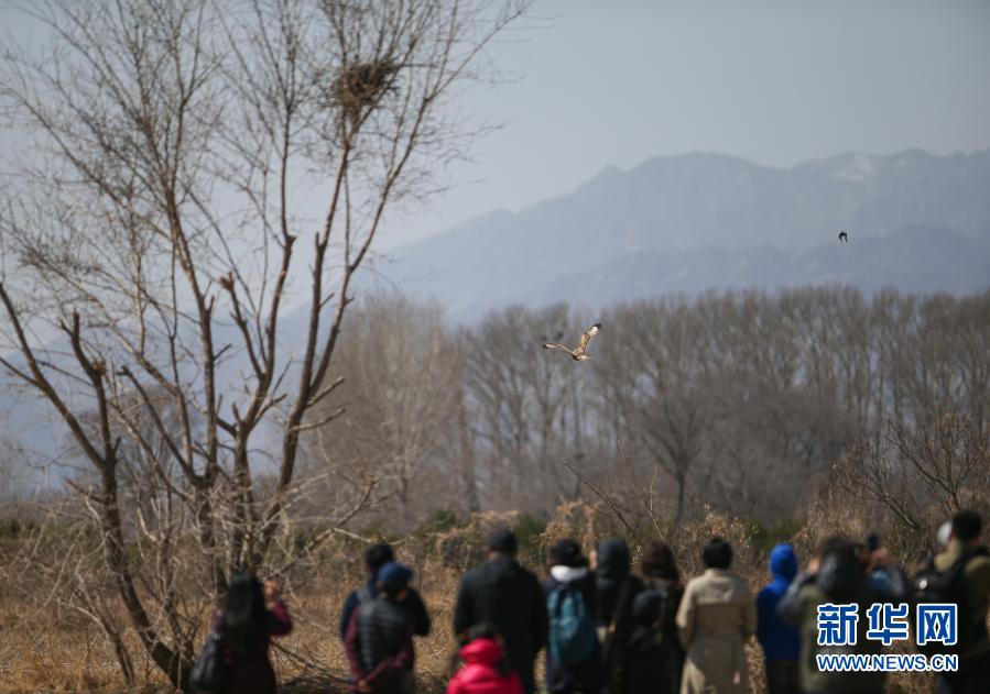 3月20日,參加放飛活動的人員觀看大鵟飛翔。新華社記者 李京 攝