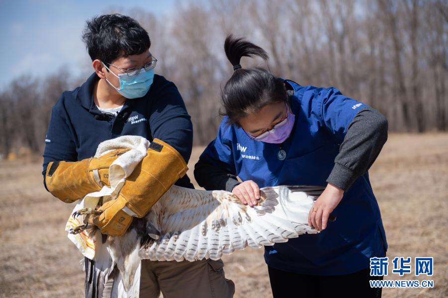 3月20日,北京猛禽救助中心猛禽康復(fù)師戴暢(右)和周蕾在放飛大鵟前對其進(jìn)行最后的檢查。新華社記者 陳鐘昊 攝