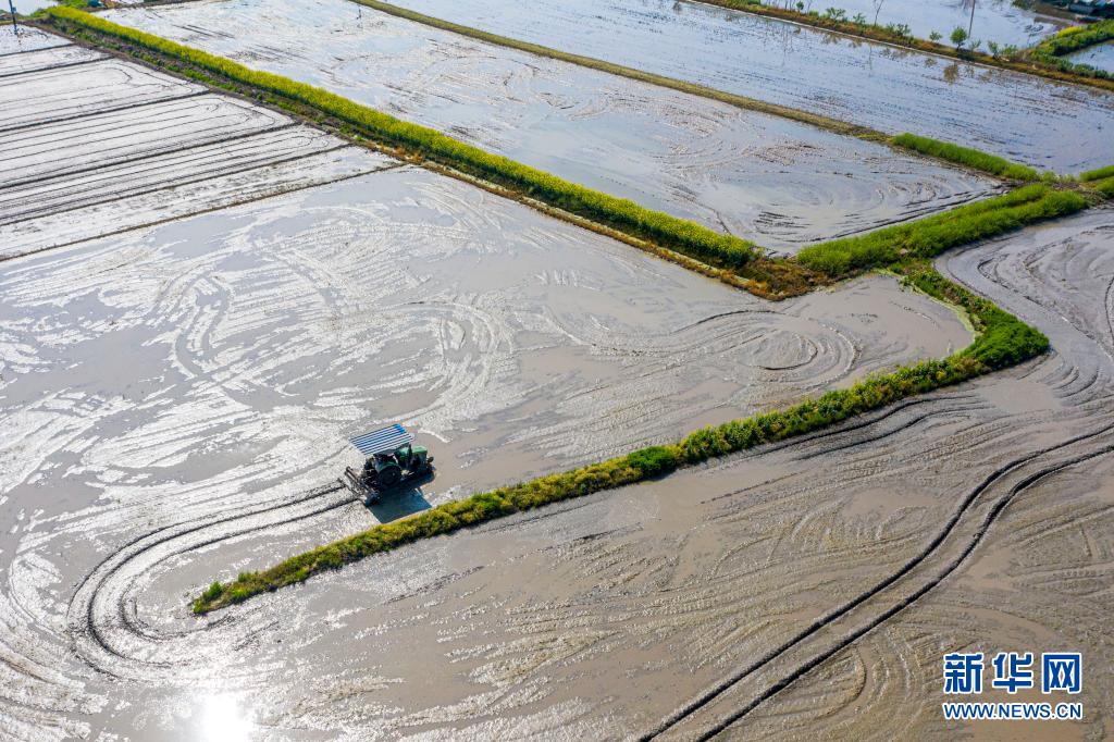 4月5日,浙江寧波余姚市黃家埠鎮(zhèn)韓夏村村民駕駛農(nóng)機在田間耕地(無人機照片)。