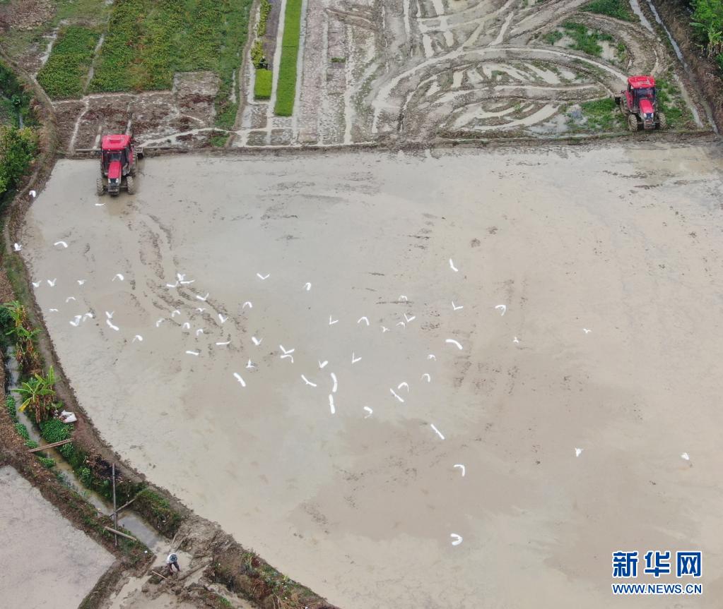 4月5日,云南西雙版納傣族自治州勐海縣勐遮鎮(zhèn)曼么勒村的農(nóng)民駕駛拖拉機耕田(無人機照片) 。