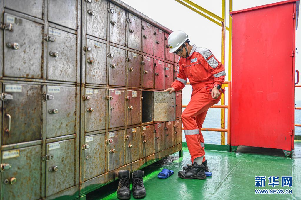 4月25日,中國海油樂東15-1氣田上的一名工人在進(jìn)入氣田作業(yè)區(qū)之前戴上安全帽并換上有助于保護(hù)腳部的工作靴。