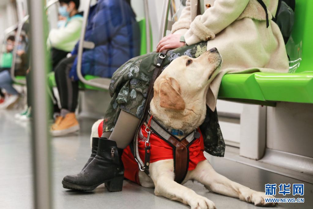 導(dǎo)盲犬“Bingo”陪伴李靜乘坐地鐵(3月27日攝)?! ⌒氯A社發(fā) (張夢(mèng) 攝)