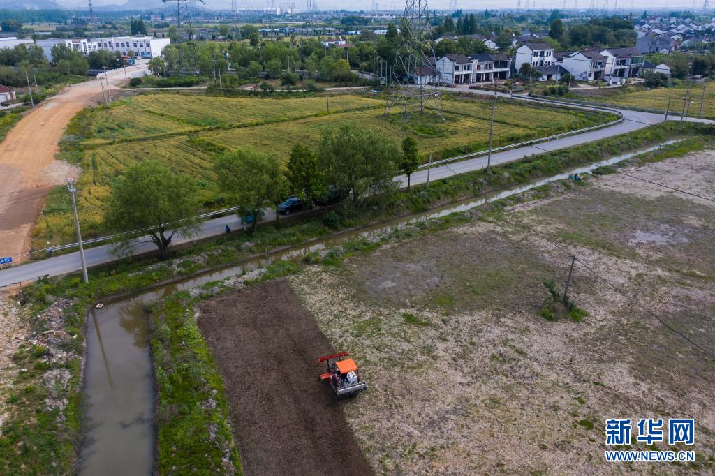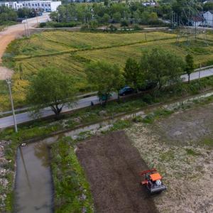 在東林鎮(zhèn)保永村,種植戶操作旋耕機(jī)耕地,準(zhǔn)備播種水稻(5月7日攝,無人機(jī)照片)。