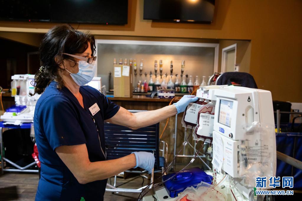 6月14日,在美國(guó)紐約州長(zhǎng)島地區(qū)的貝肖爾,工作人員在美國(guó)紐約血液中心舉行的獻(xiàn)血活動(dòng)上處理采集的血液。
