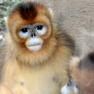 北京動物園內的滇金絲猴在室內乘涼(6月28日攝)。