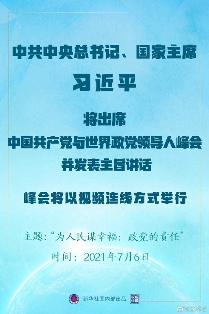 中共中央對外聯(lián)絡部發(fā)言人胡兆明5日宣布,中國共產黨與世界政黨領導人峰會將于7月6日以視頻連線方式舉行,中共中央總書記、國家主席習近平將在北京出席會議并發(fā)表主旨講話。此次會議的主題為“為人民謀幸福:政黨的責任”,160多個國家的500多位政黨和政治組織等領導人以及逾萬名政黨代表等將出席會議。