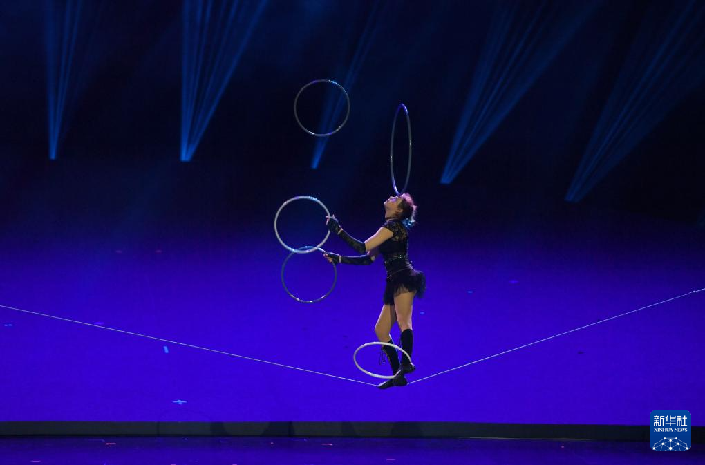 10月24日,乌克兰杂技演员在表演《女子软钢丝》。