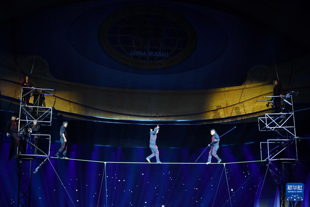 10月24日,来自阿根廷、哥伦比亚的杂技演员在表演《高空钢丝》。