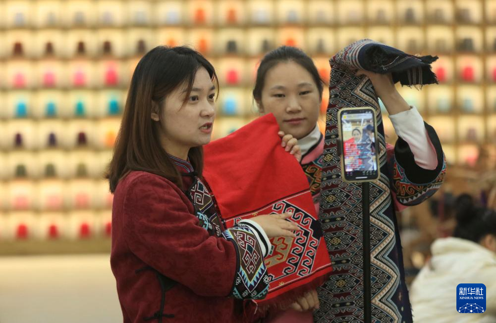 11月12日,在张家界市武陵源区乖幺妹土家族织锦基地,工人在直播销售土家族织锦产品。