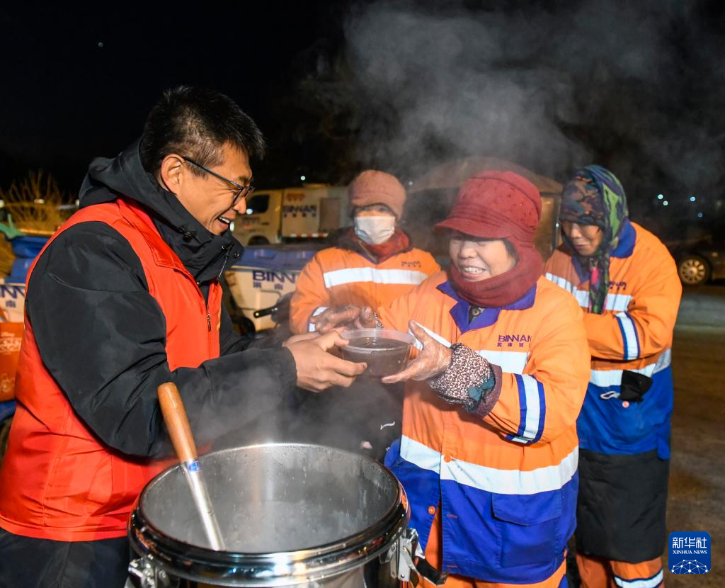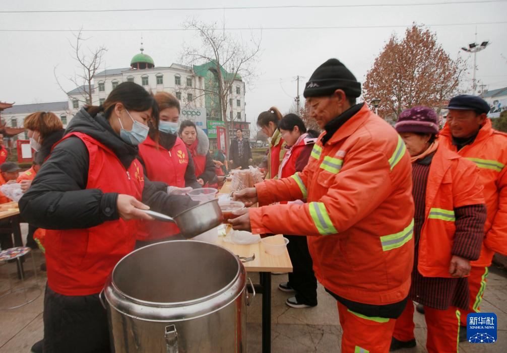 1月18日,河北省遵化市志愿者给环卫工人送上腊八粥。