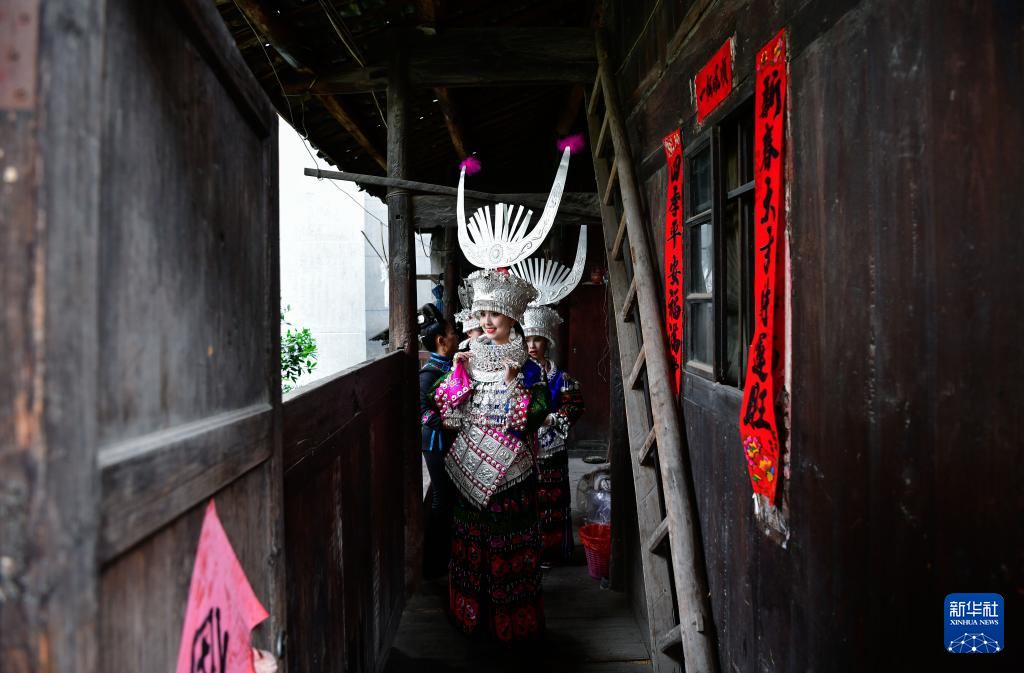 4月21日,苗族女孩们穿上节日盛装,准备参加苗族姊妹节盛装游演。