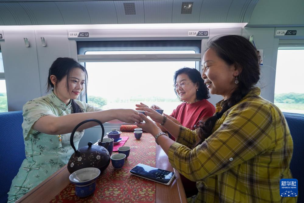 5月20日,南京客运段工作人员(右一)在G2807次高铁列车车厢内进行茶艺表演。