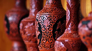 6月10日在海口市文华菜市场举办的菜市场非遗生活周活动上拍摄的椰雕工艺品。
