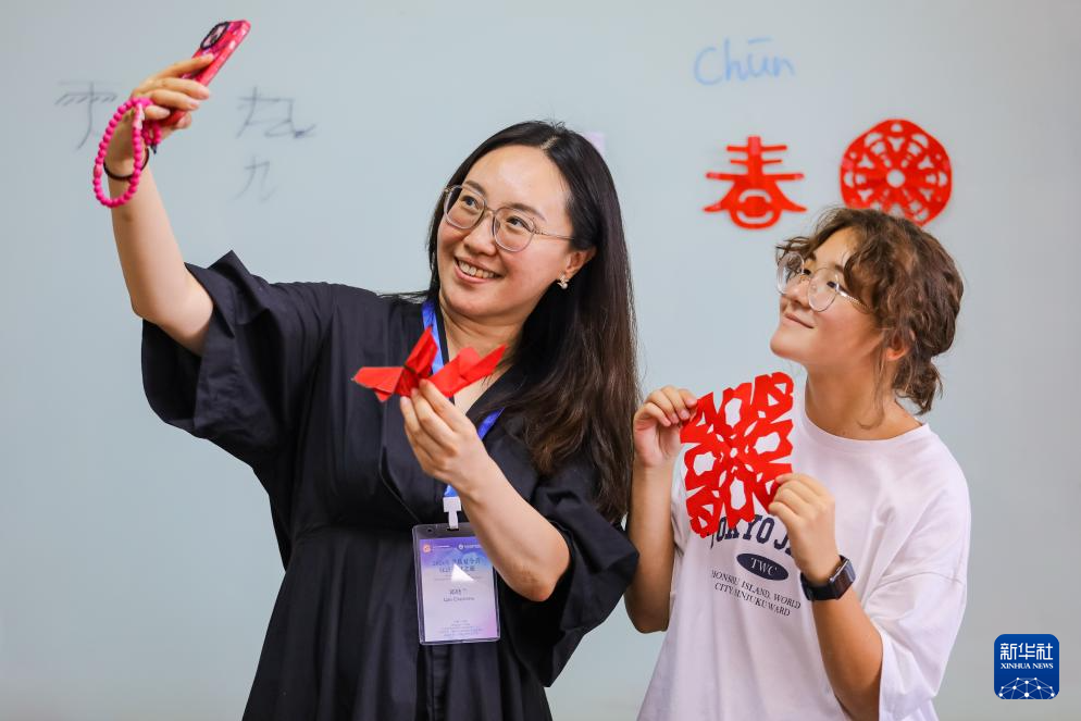 8月12日,在山东省青岛恒星科技学院,中俄学生交流剪纸创作。
