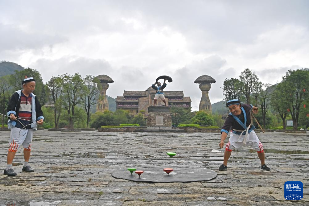 何光斌在南丹县里湖瑶族乡朵努社区展示空中放陀螺(8月30日摄)。