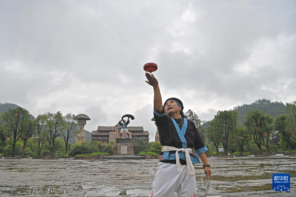 何光斌在南丹县里湖瑶族乡朵努社区展示指尖陀螺(8月30日摄)。