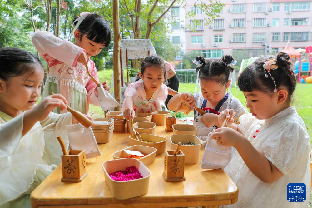9月13日,福建武夷山市实验幼儿园朱子校区的小朋友在制作香包。