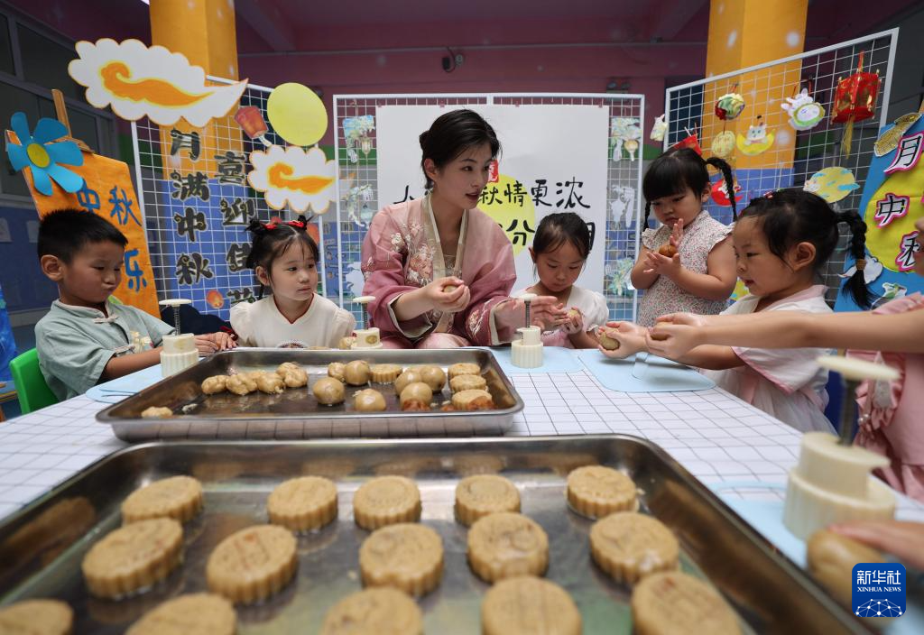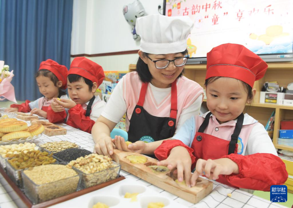 9月13日,河北省石家庄新乐市市直第三幼儿园的孩子在老师的指导下制作传统月饼。