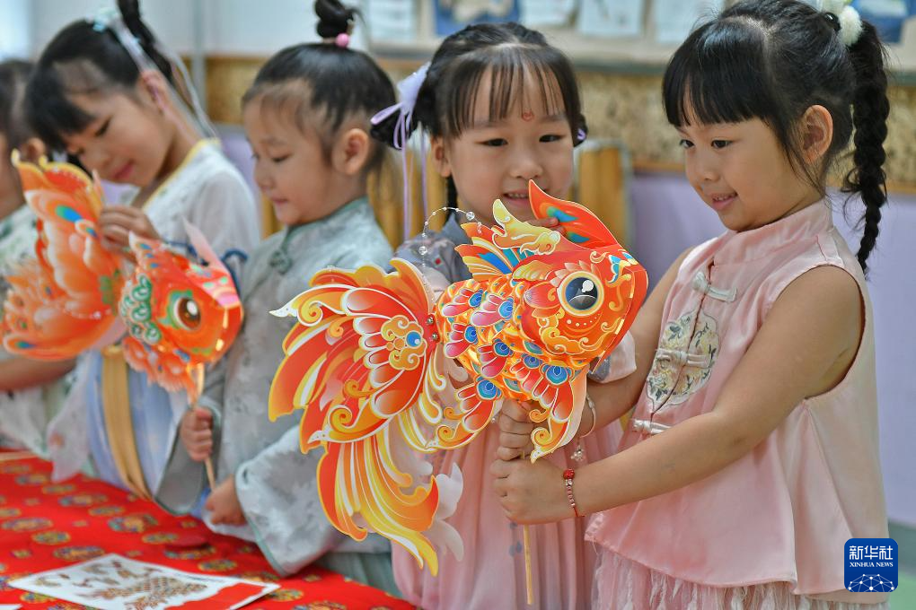 9月13日,山东省烟台市福山区清洋街道中心幼儿园的小朋友在制作金鱼花灯。