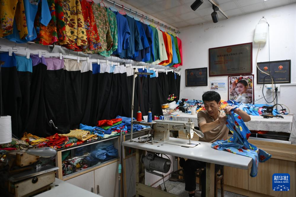 在福建泉州蟳埔村,蟳埔女习俗代表性传承人黄晨在工作室里裁剪一件蟳埔女服饰(8月27日摄)。