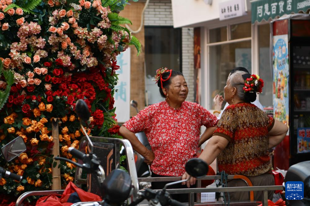 在福建泉州蟳埔村,簪好花围的翁秀珍出门买菜(8月28日摄)。