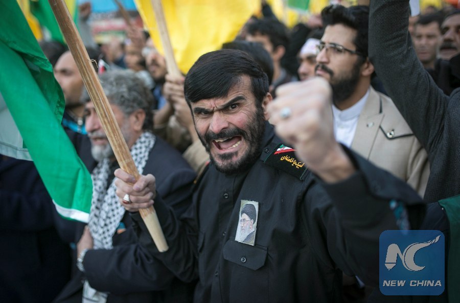 A man shouts slogans during a protest against U.S. recognition of Jerusalem, in Tehran, Iran, on Dec. 11, 2017. Thousands of Iranians held a rally on Monday to condemn the U.S. President Donald Trump's recent decision on Jerusalem. (Xinhua/Ahmad Halabisaz)