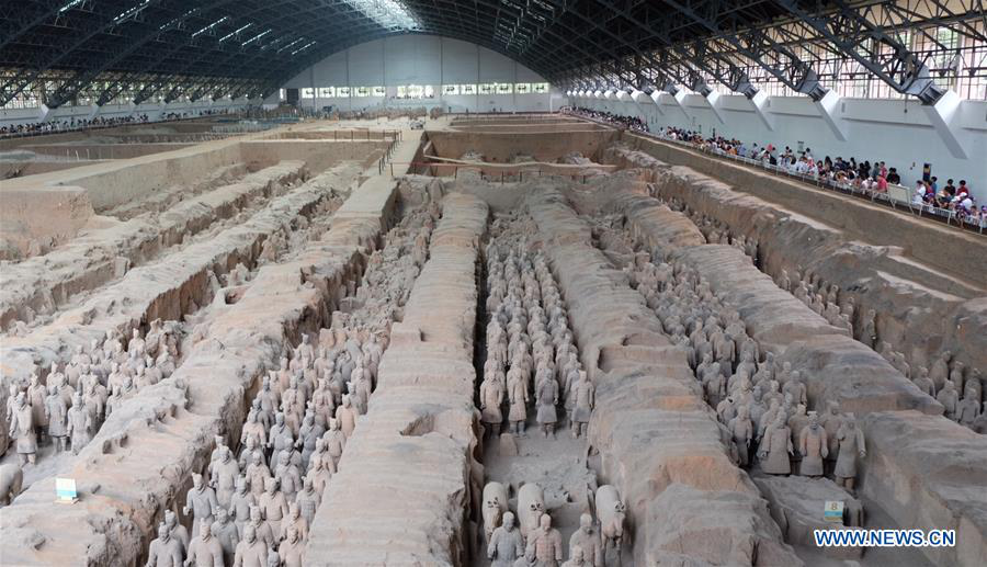 People view terracotta warriors at Emperor Qinshihuang's Mausoleum Site Museum in Xi'an, capital of northwest China's Shaanxi Province, July 16, 2017. Lots of people came to visit the Emperor Qinshihuang's Mausoleum Site Museum as the high season began. (Xinhua/Zhang Shuzhong)