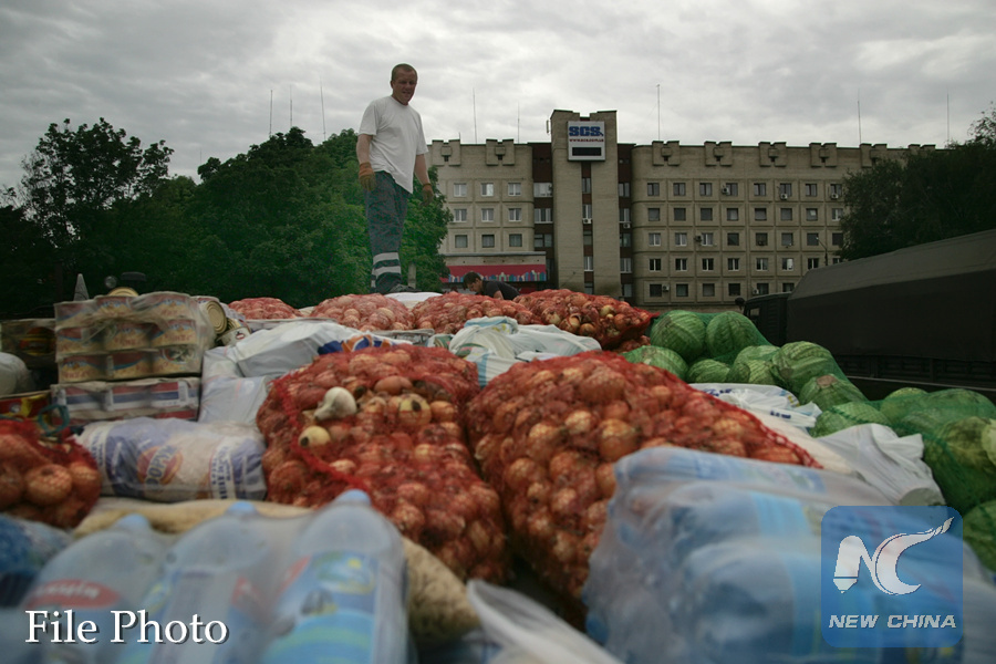 A Ukrainian soldier prepares to distribute food to residents in Slavyansk, Ukraine, July 6, 2014. (Xinhua/Alexander Ermochenko)