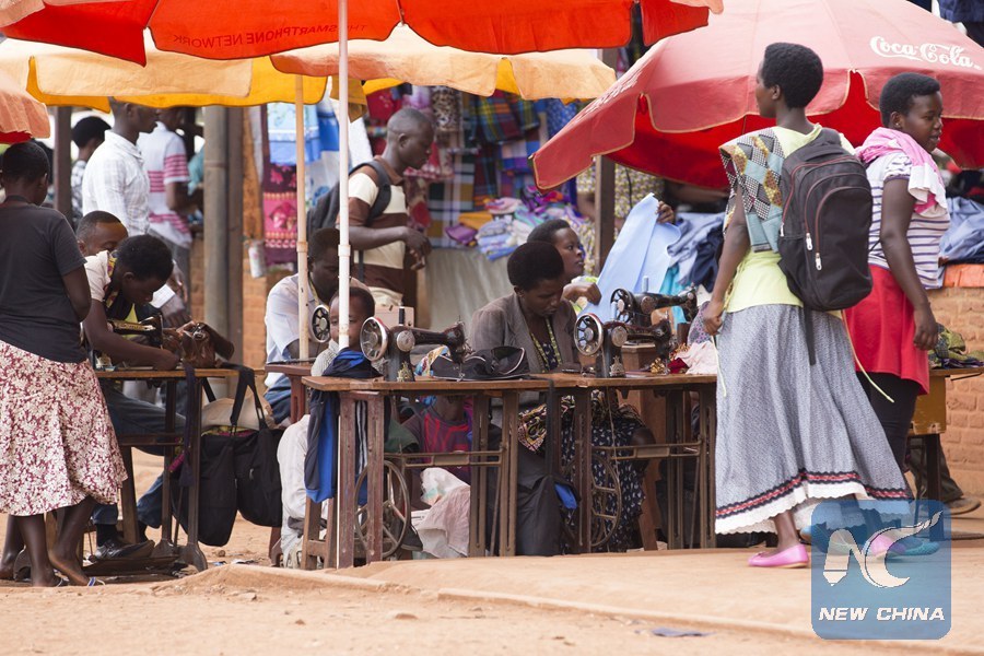 File photo taken on Feb. 22, 2018 shows people offer a sewing service in a market in Rwamagana District, Rwanda.(Xinhua/Gabriel Dusabe)