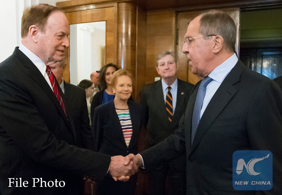 Russian Foreign Minister Sergey Lavrov (R) greets US Senator Richard Shelby (L) during his meeting with US congressional delegation in Moscow, Russia, on July 3, 2018. (AFP PHOTO)
