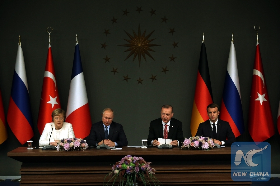German Chancellor Angela Merkel, Russian President Vladimir Putin, Turkish President Recep Tayyip Erdogan and French President Emmanuel Macron (from L to R) attend a joint press conference following a four-way summit between Turkey, Russia, Germany and France in Istanbul, Turkey, on Oct. 27, 2018. (Xinhua/Anadolu Agency)
