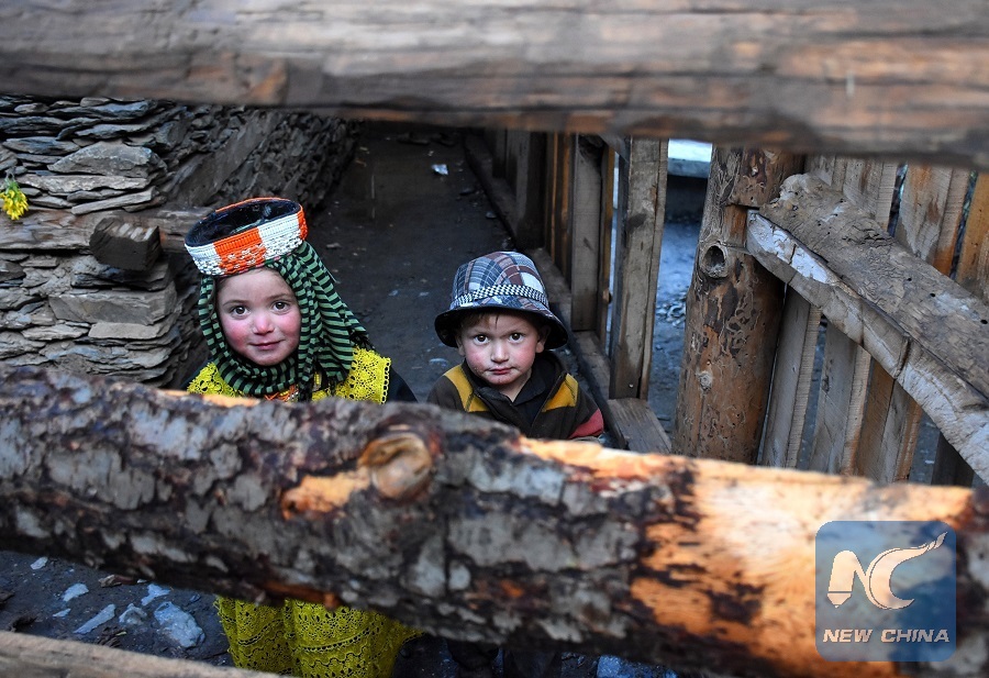 Kalash children play outside their home in Kalash Valley in northwest Pakistan's Chitral District on May 14, 2018. (Xinhua/Saeed Ahmad)