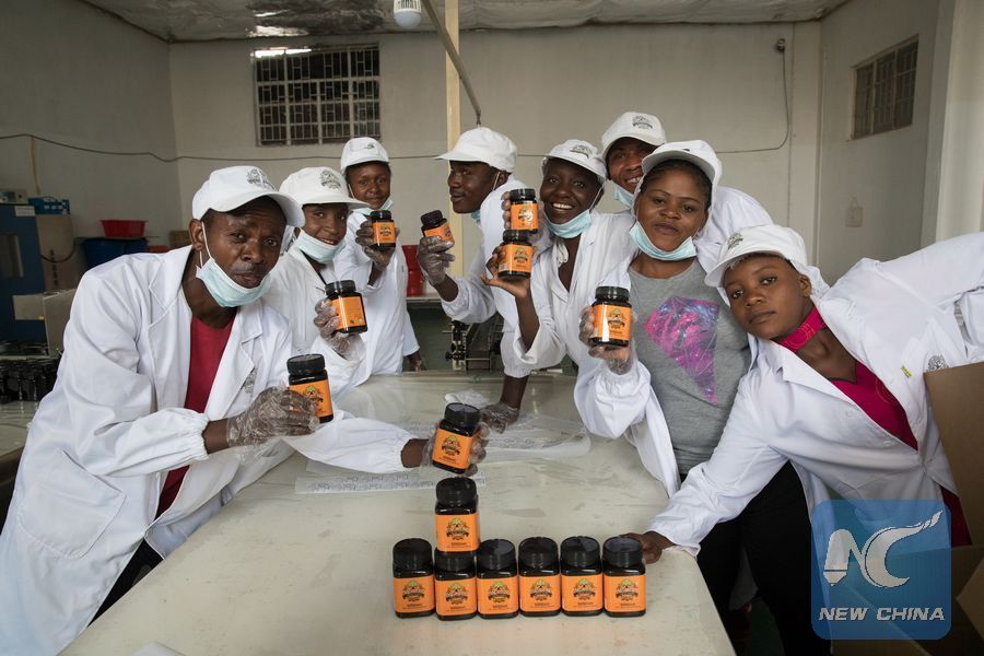 File photo shows workers at Mpund Wild Honey, a Chinese-run firm, display the fully packaged honey in central Zambia's Kabwe town, Nov. 3, 2018. (Xinhua/Peng Lijun)