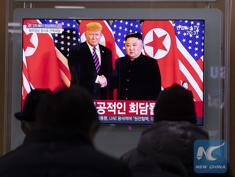 People watch a TV live broadcast on top leader of the Democratic People's Republic of Korea (DPRK) Kim Jong Un meeting with U.S. President Donald Trump in Seoul, South Korea, Feb. 27, 2019. (Xinhua/Lee Sang-ho)