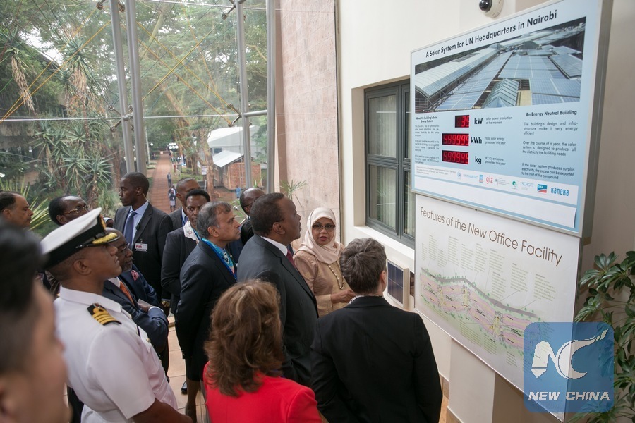 Uhuru Kenyatta (C), Kenyan President looks at a design of a solar system of the new office facility at the United Nations headquarters during the opening ceremony of the first session of the UN-Habitat Assembly in Nairobi, Kenya, May 27, 2019. (Xinhua/Fred Mutune)