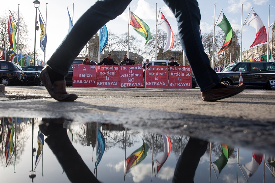 Demonstrators stand outside the Houses of Parliament in London, Britain, March 11, 2019. (Xinhua/Joe Newman)