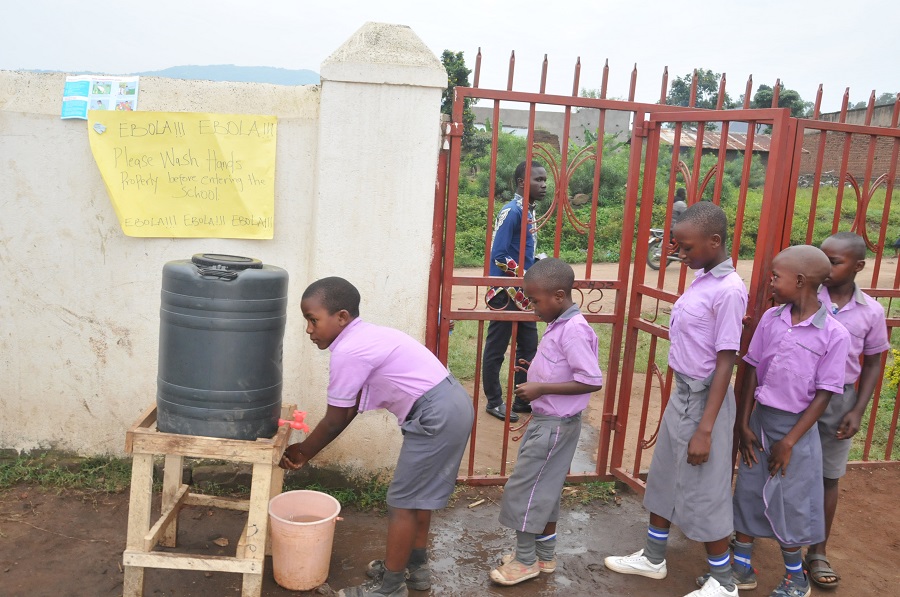 Pupils queue to wash their hands with chlorinated water to prevent the spread of Ebola at Quality Model Primary School in Kasese district, Western Uganda, June 18, 2019. (Xinhua/Nicholas Kajoba)
