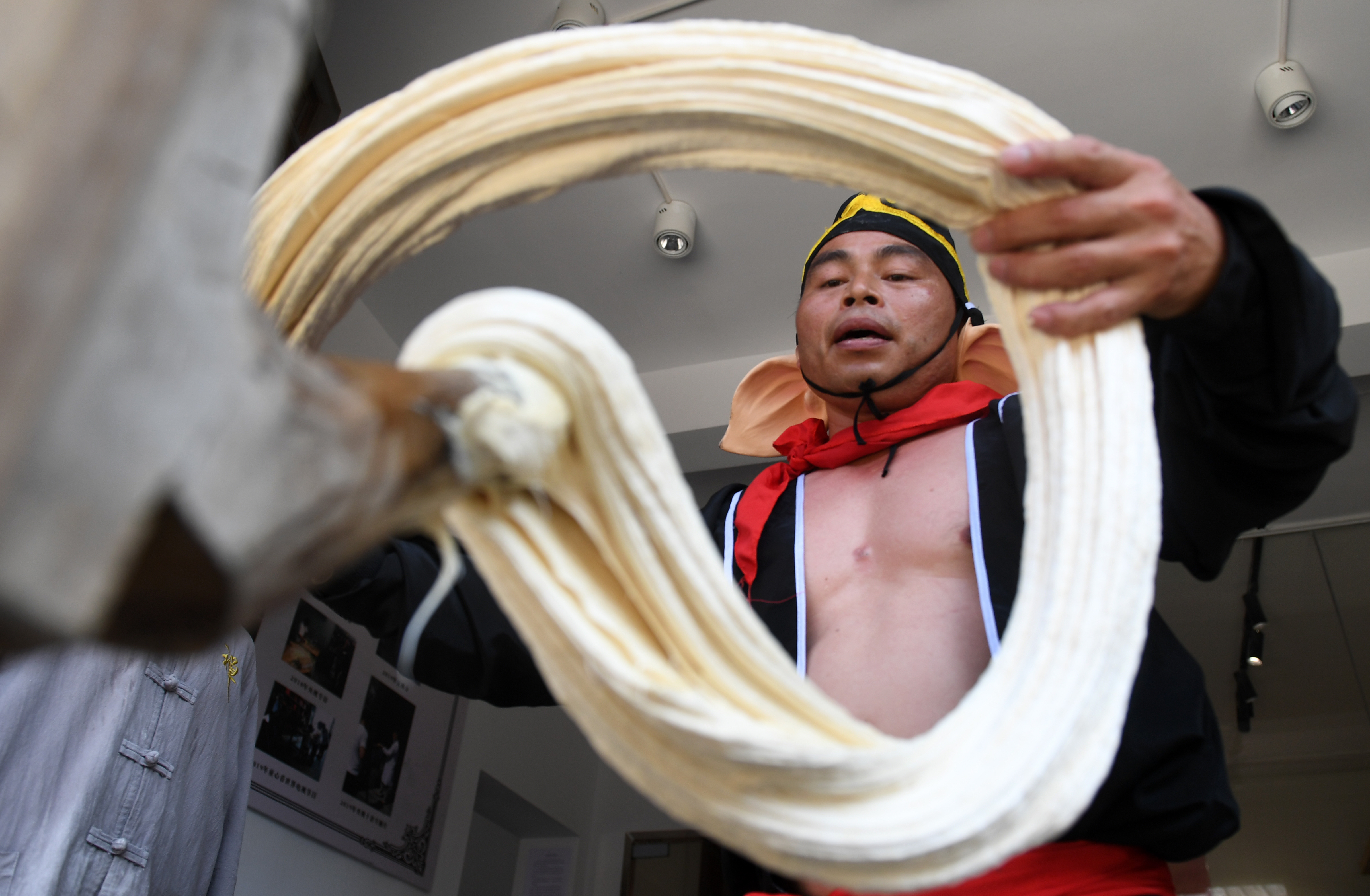 A staff member displays the rice noodles at the Jiangxi style snack street in Shuinan Village, Anyi County, east China's Jiangxi Province, Aug. 8, 2019. (Xinhua/Lu Boan)
