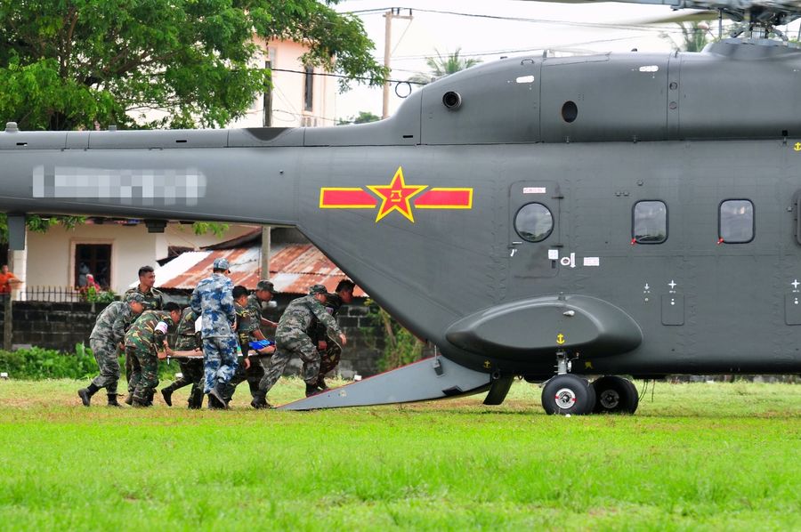 A Z-8G newly modified ambulance helicopter soon landed next to the improvised tent hospital. After cleaning and disinfection, the China-Laos joint Forces immediately carried the patient on to the helicopter, to be transported to the hospital for better treatment.