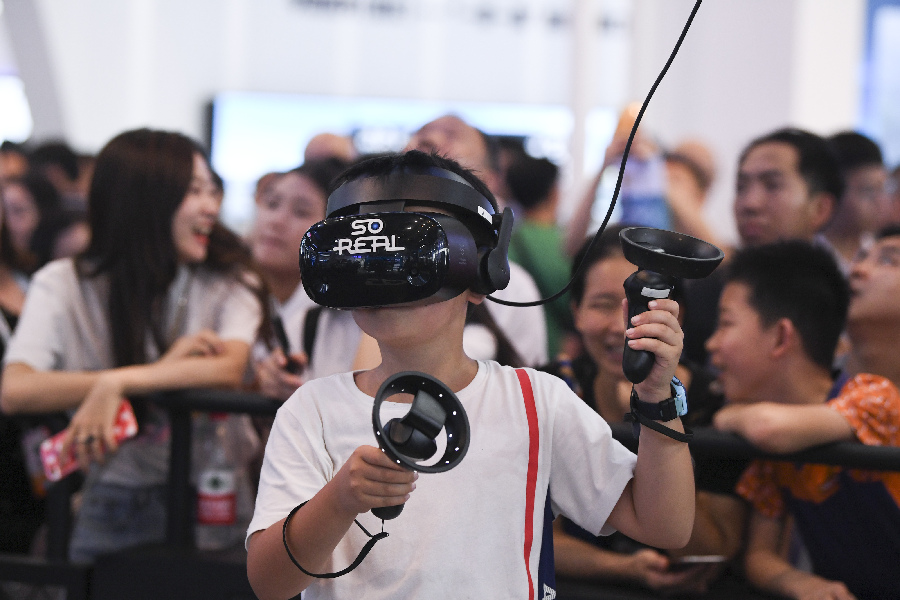 A visitor to the 2019 Smart China Expo experience a VR game in south China's Chongqing. (Xinhua/Wang Quanchao)
