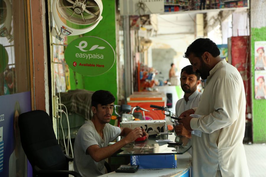 Pakistani people stand at a shop for online payment transaction via "Easypaisa" a digital financial service, in Islamabad, capital of Pakistan on Aug. 29, 2019. (Xinhua/Ahmad Kamal)