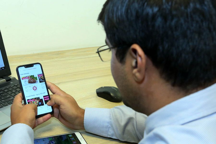 A Pakistani man selects food using "Foodpanda" a mobile application to order food in Islamabad, capital of Pakistan, on Aug. 20, 2019. (Xinhua/Ahmad Kamal)