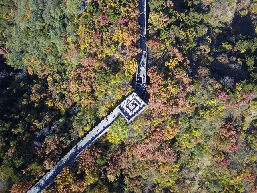 Aerial photo shows autumn scenery at the Mutianyu Great Wall in Beijing, Nov. 4, 2019. (Xinhua/Chen Zhonghao)