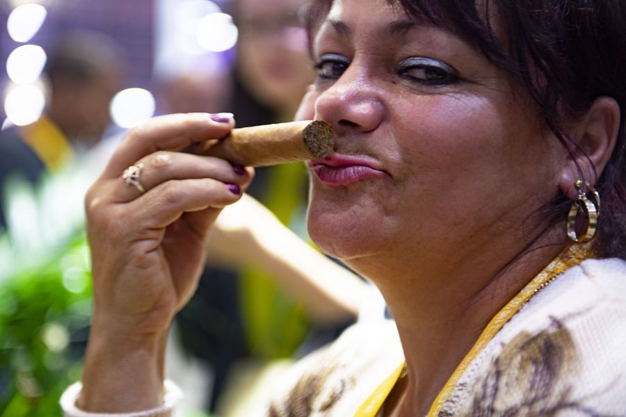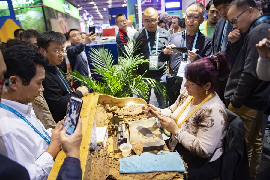 A Cuban exhibitor shows a cigarette rolled by hand during the second China International Import Expo (CIIE) in Shanghai, east China, Nov. 7, 2019. (Xinhua)
