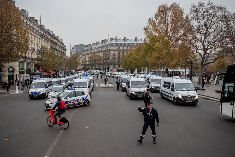 Police officers stand guard during a demonstration in Paris, France. (Photo by Zi Yang/Xinhua)