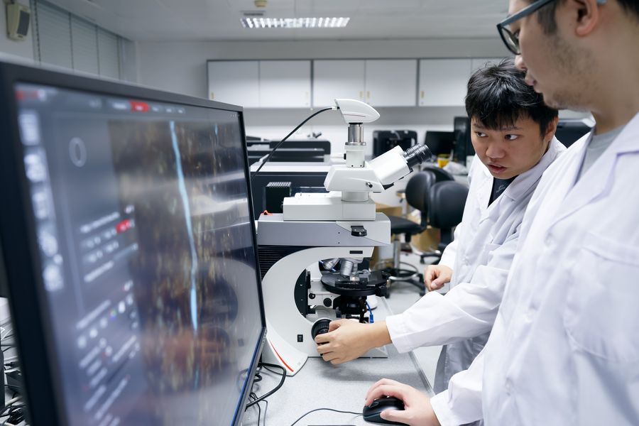 Photo taken on Oct. 30, 2019, shows researchers at the China's State Key Laboratory of Lunar and Planetary Science in Macao University of Science and Technology. (Xinhua/Liu Jinhai)