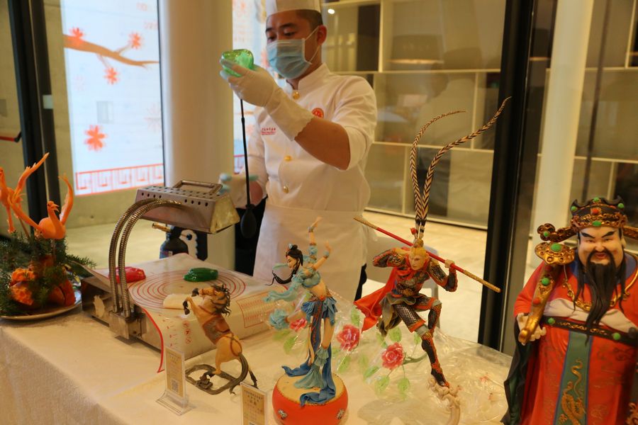 A Chinese chef demonstrates his skills in blowing sugar figurines in Paphos, Cyprus, Jan. 14, 2020.(Xinhua/Zhang Baoping)