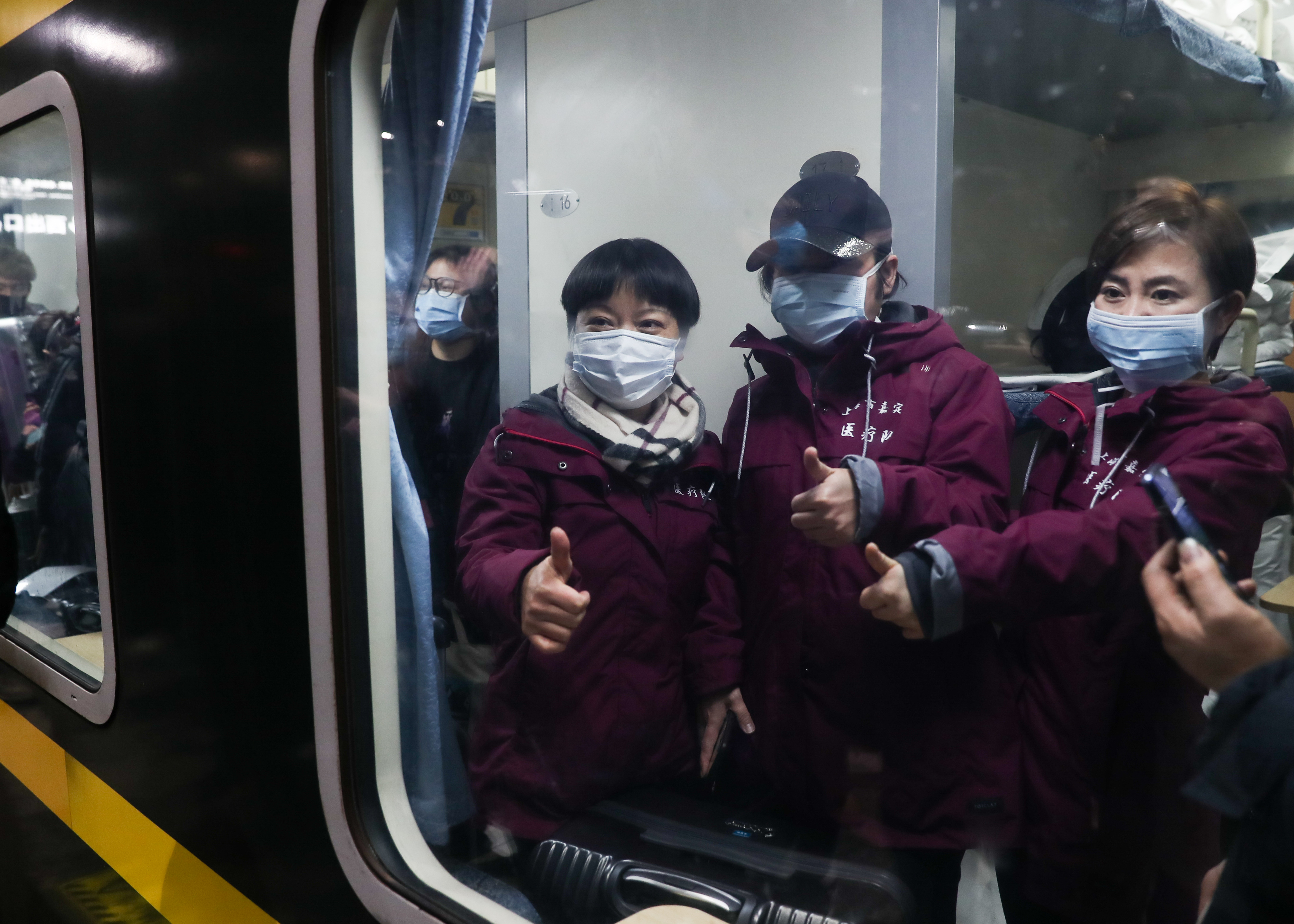 Medical team members take the train to Hubei Province in Hefei, east China's Anhui Province, Jan. 27, 2020. (Xinhua/Zhang Duan)