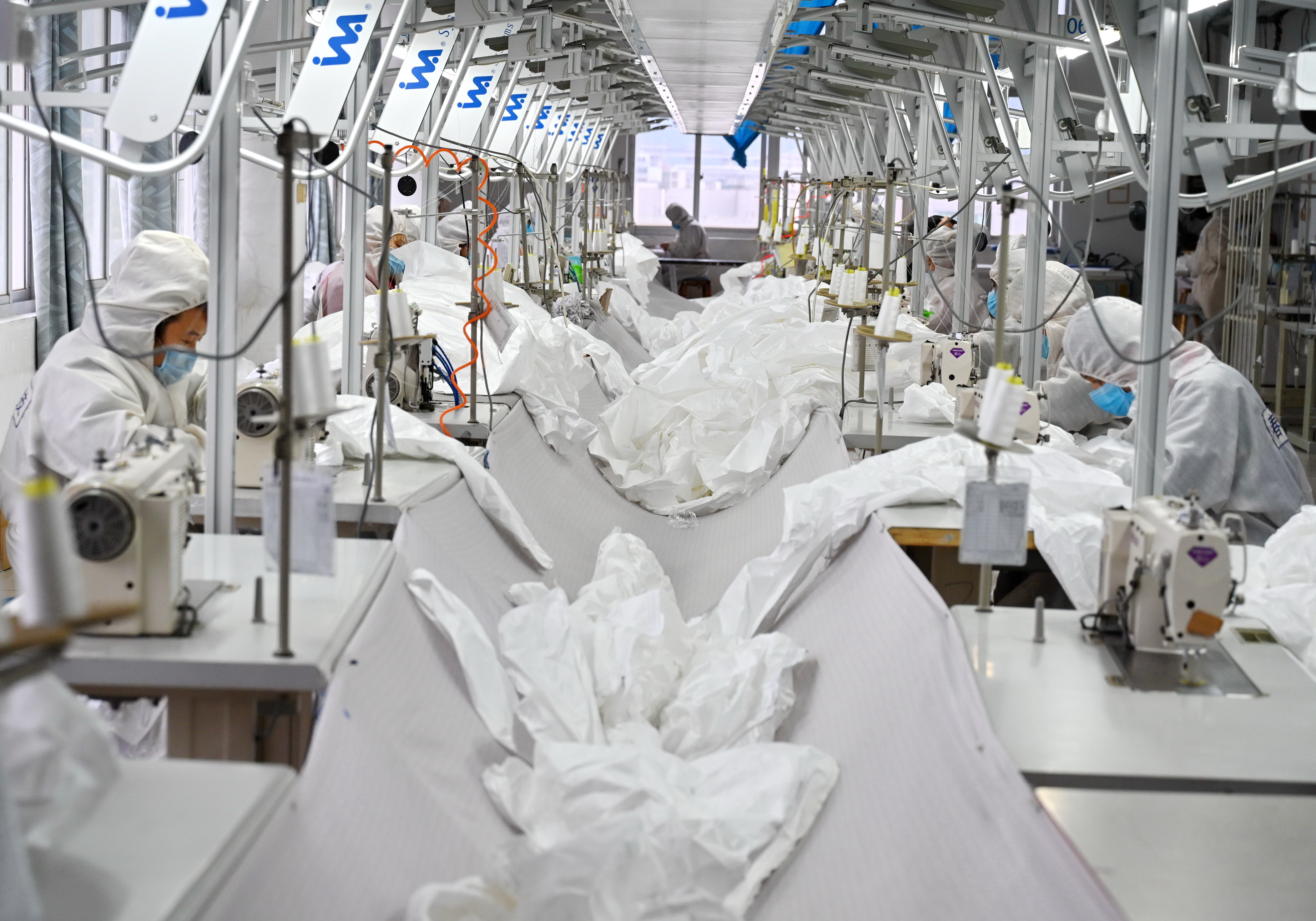 People make protective suits at the workshop of a company in Fuzhou, southeast China's Fujian Province, Feb. 2, 2020. (Xinhua/Lin Shanchuan)
